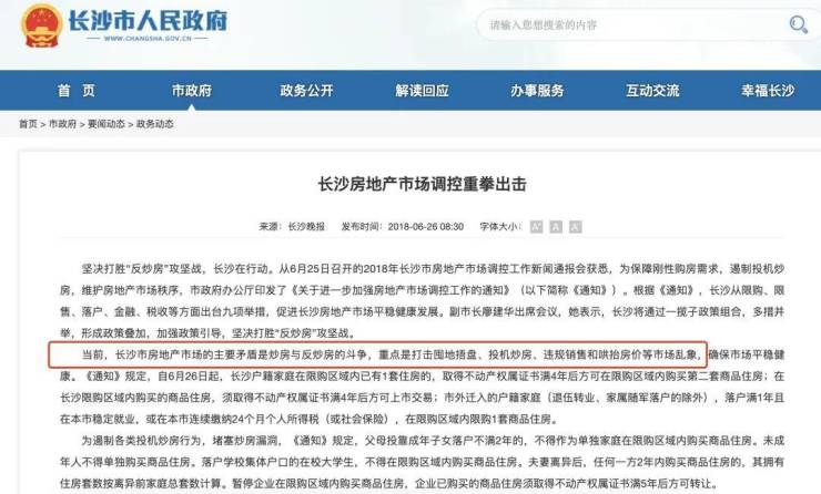 在2018年6月,长沙市政府在加强房地产市场调控的通气会上对市场矛盾定性——当前,长沙市房地产市场的主要矛盾是炒房与反炒房的斗争,重点是打击囤地捂盘、投机炒房、违规销售和哄抬房价等市场乱象,确保市场平稳健康。