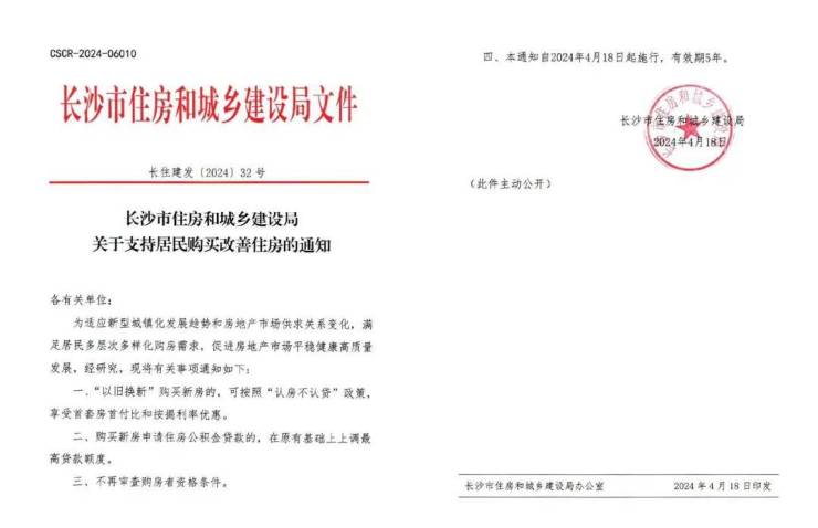 4月18日,长沙市住建局印发的《关于支持居民购买改善住房的通知》(下称通知)显示,即日起,全市范围内买房,不再审查购房者资格条件;“以旧换新”购买新房,可按照“认房不认贷”政策,享受首套房首付比和按揭利率优惠;购买新房申请住房公积金贷款,在原有基础上上调最高贷款额度。