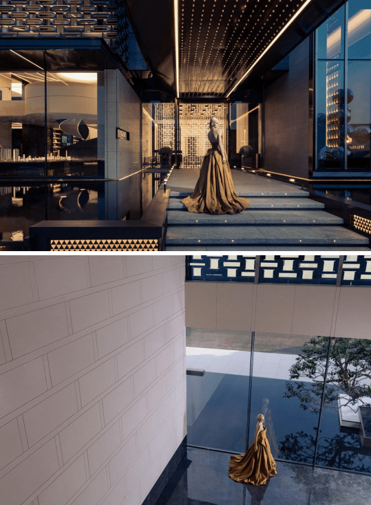 目光所及的第一眼,即决定了一座建筑的美学品位。转角艺术橱窗的星空雨棚,灿若星河,宝石的切割金属线条勾勒出轻奢的精致。橱窗内珍藏一颗约1.98M高的珠宝造型不锈钢雕塑,就像秦淮金茂府如稀世珍宝闪耀于南部新城机场跑道公园之上。艺术家历经49天精心打磨,外部饱满圆滑夺目耀眼,内部18层如同昙花一现般深邃迷人。星河蓝色系与水景相映成趣,奏响了归家的摩登乐章,启幕一场都会繁华之中的艺术之旅。