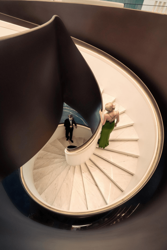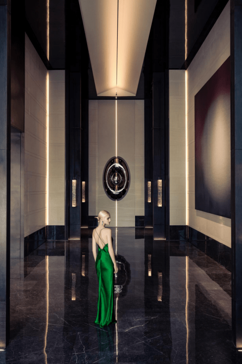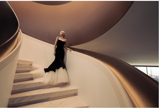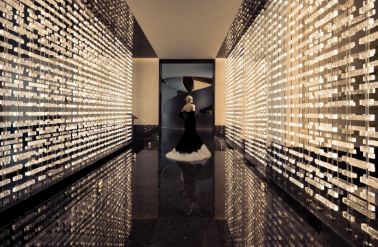 访客会所内更是演绎了“金陵于飞,云端之上”的设计理念,营造了三重生活境界——“登云境”、“归云境”、“栖云境”。艺术门厅的“锦云-礼序”,以现代手法利用水晶装置打造极具视觉冲击力的“历史天书”,似乎在提醒我们十里秦淮才是书写金陵文脉的千年诗河;“凌云-叠空”,约10米挑高的艺术长廊,则是波澜壮阔2600米机场跑道公园的缩影;秦淮自古繁华源于水,“阅云-和鸣”左右两侧的水景排布由此而生;“登云-而飞”的旋转楼梯,就像一座时光雕塑,牵引着秦淮金茂府向上腾飞,传承过去,延绵未来。