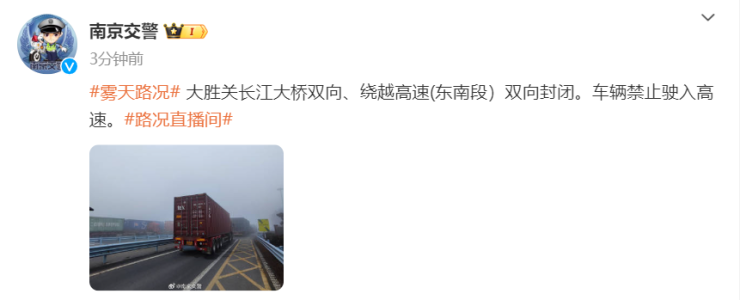 大胜关长江大桥双向、绕越高速(东南段)双向封闭。车辆禁止驶入高速。