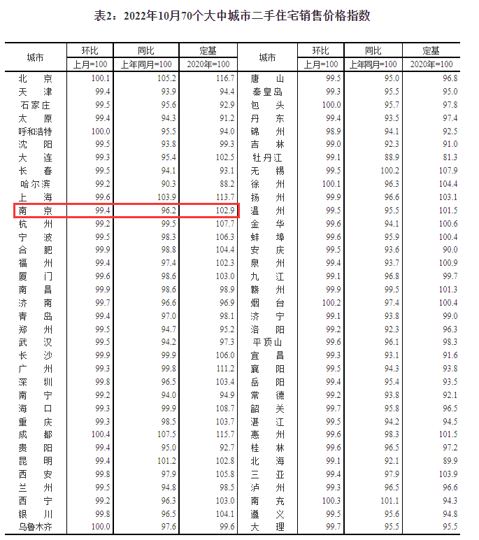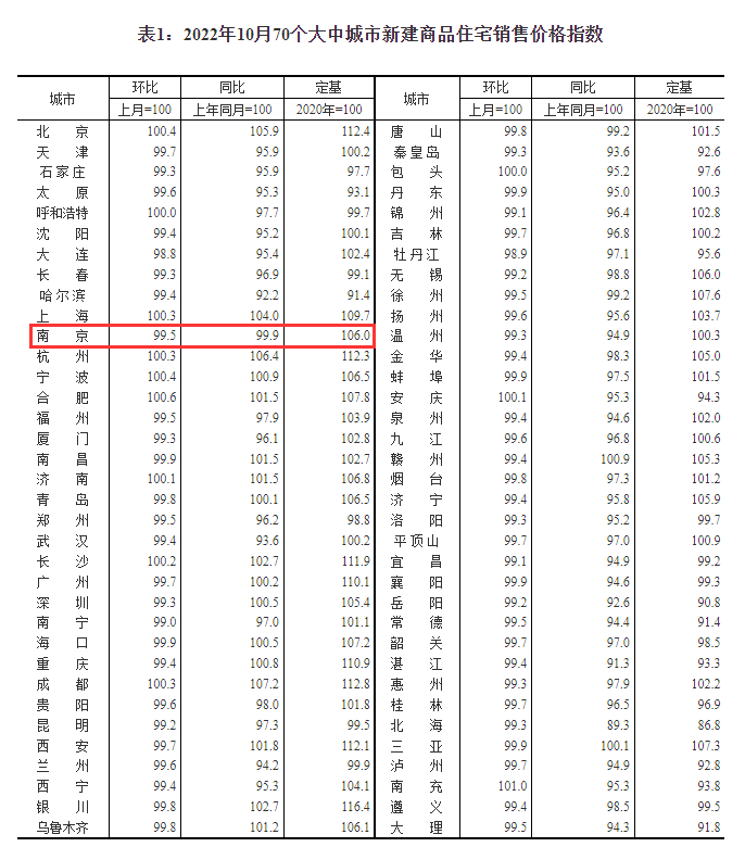 今天上午,国家统计局最新发布了2022年10月份70个大中城市商品住宅销售价格变动情况统计数据。其中,10月南京新房价格环比下跌0.5%、同比下跌0.1%,二手房价格环比下跌0.6%、同比下跌3.8%。