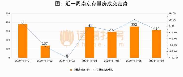 从存量房来看,2024年11月07日南京存量房单日成交312套,比昨日减少40套,环比下降11.4%。从近一周存量房成交来看,南京存量房日均成交套数为259套,11月07日单日成交312套,高于近一周平均水平20.5%。