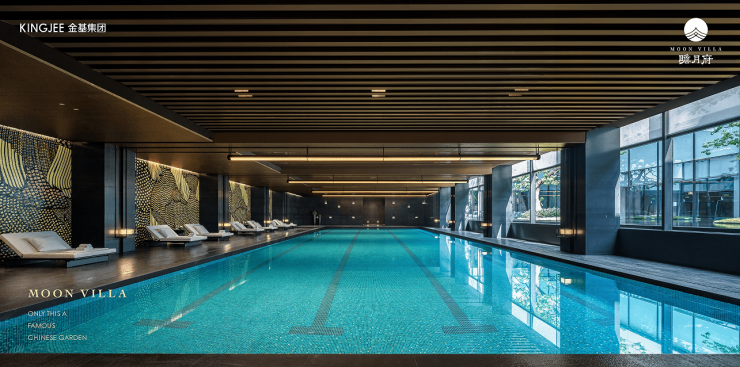 恒温泳池,过水池采用整块石材雕刻而成砚台造型,呼应东方园居,墙面冰瓷玉马赛克壁画,流光溢彩……顶部采用金属木纹格栅镶嵌白玉透光云石,宛若秦淮画卷,池底金玉结合、碧波粼粼,处处彰显高奢度假感。