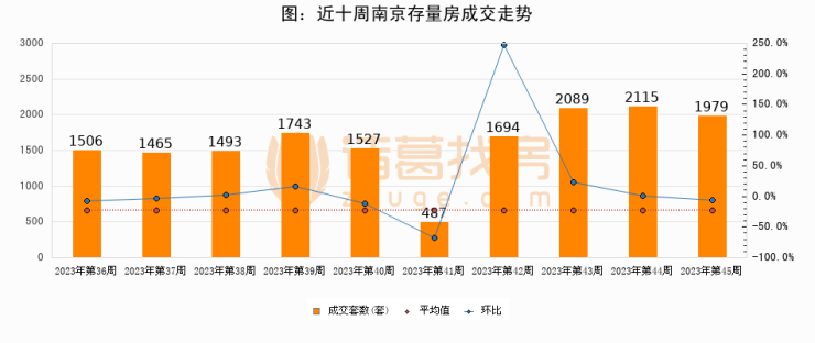 存量房方面,第45周南京存量房成交1979套,较上周减少136套,环比下降6.4%。从近十周成交走势来看,周均成交套数为1609套,本周高于平均水平23%。