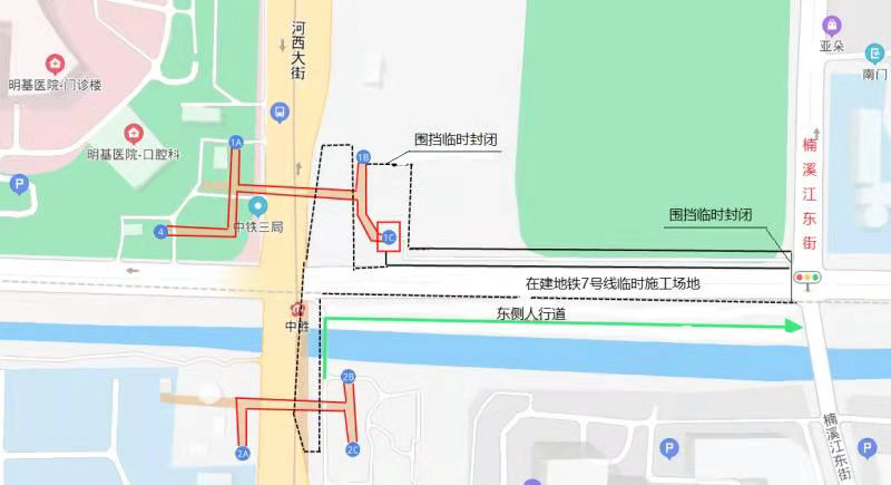 既有10号线中胜站、楠溪江东街至河西大街的市民乘客请沿围挡东侧人行便道行至河西大街2B地铁出入口进入既有10号线中站。