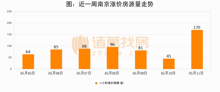 根据诸葛找房数据显示,南京24小时涨价房源量为170套,较05月10日增加125套,环比上涨277.8%。与此同时,涨价房源占比小幅扩大,业主信心有所提升。