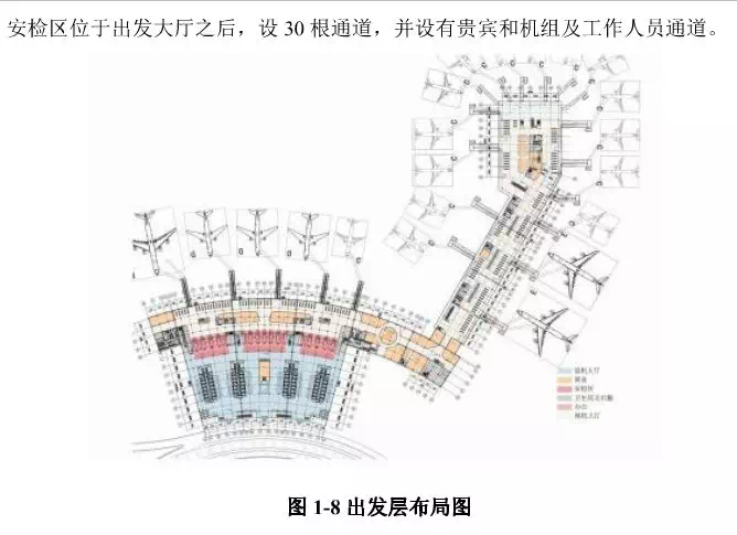 航站楼还见采用“两层式”旅客流程,出发到达旅客上下分层,出发层在上,到达层在下。出发旅客由出发层车道边进入航站楼,通过安检可到达登机口,由坡道登机。