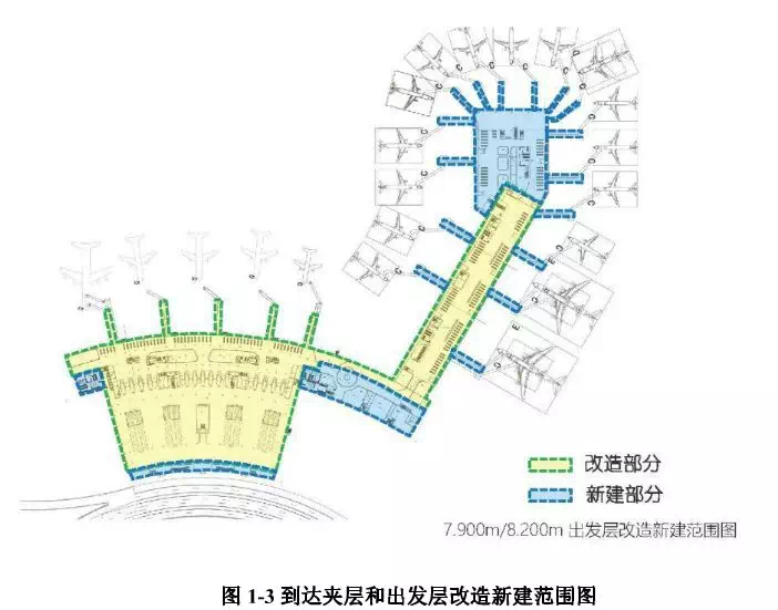 此次T1航站楼南指廊改扩建工程主要包含改建T1航站楼主楼,扩建北指廊及连廊,停用南指廊,改扩建陆侧高架桥、停车场及空侧机。
