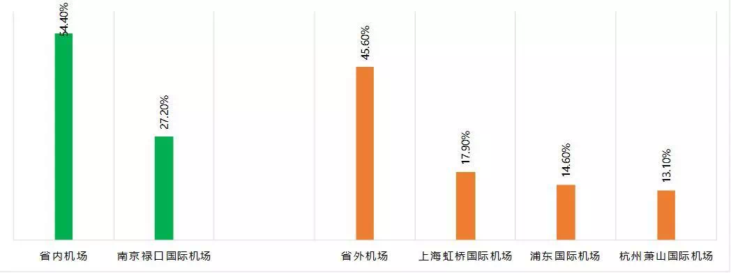 南京市航空出行主要利用南京禄口国际机场(占比约为76%),上海浦东国际机场(占比约为14%),杭州萧山国际机场(占比约为13%)。