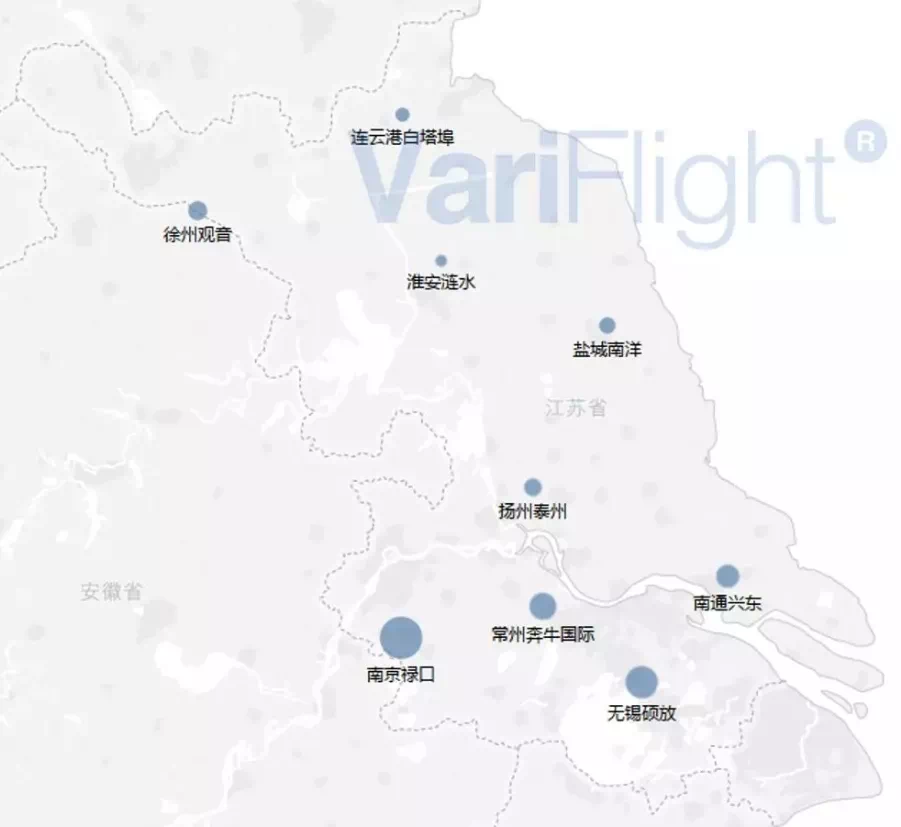 南京禄口国际机场(NKG)、无锡硕放国际机场(WUX)、 常州奔牛国际机场(CZX)、徐州观音国际机场(XUZ)、南通兴东国际机场(NTG)、扬州泰州国际机场(YTY)、连云港白塔埠国际机场(LYG)、盐城南洋机场(YNZ)、淮安涟水机场(HIA)。