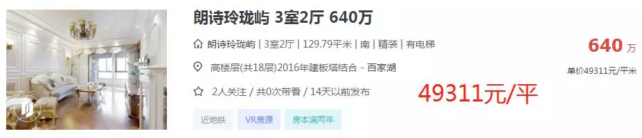 狐妹选取较具有代表性的几个小区为例,朗诗玲珑屿作为区域内房龄新品质高的学区房之一,房价一直高居不下,目前大部分房源挂牌价都在4.4万/平左右,也有不少4.6万+的房源,目前较高一套挂牌价已高达49311元/平!