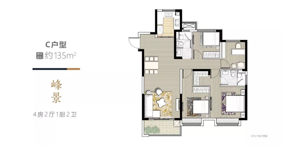 约93-135㎡全龄精装社区,满足不同年龄段需求,各个户型均有功能房配置,与主卧室互不干扰。