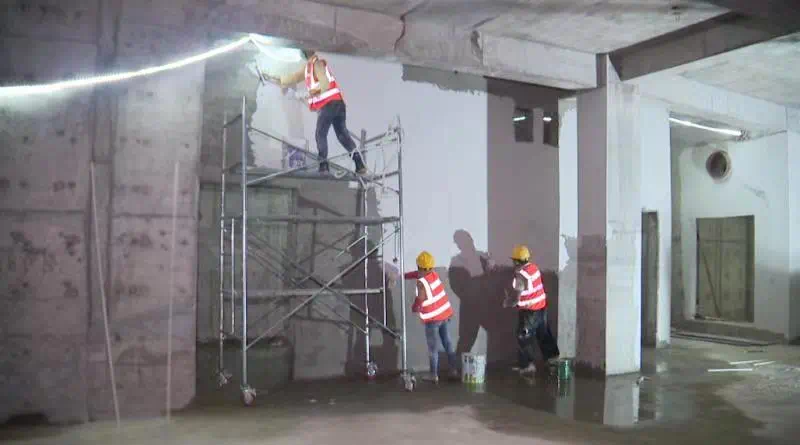 眼下,近80名工程建设者分成3个班组,分区域开展砖墙粉刷、内墙喷浆等室内装修作业。