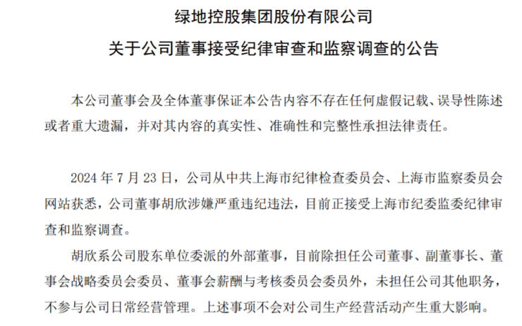 绿地控股董事胡欣涉嫌严重违纪违法,正接受纪律审查和监察调查