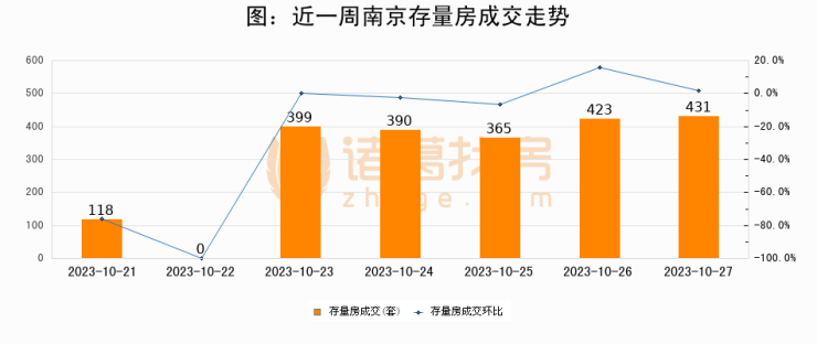 从存量房来看,2023年10月27日南京存量房单日成交431套,比昨日增加8套,环比上涨1.9%。从近一周存量房成交来看,南京存量房日均成交套数为303套,10月27日单日成交431套,高于近一周平均水平42.2%。