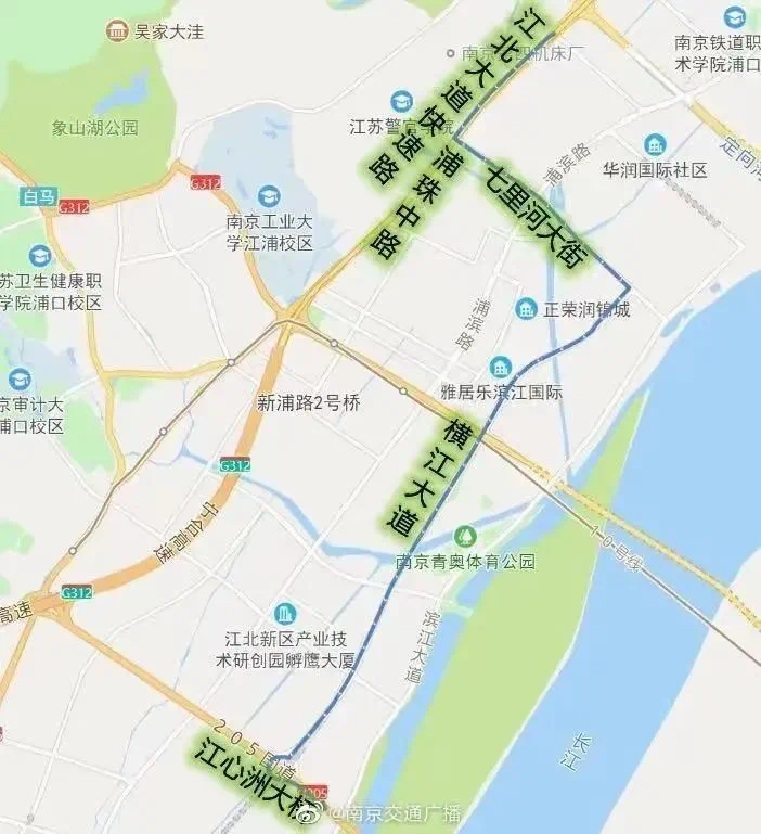 经江北大道前往应天大街隧道方向进城车辆可从七里河大街、浦滨路绕行;前往五桥方向进城车辆可从七里河大街、横江大道绕行;出城需驶入江北大道车辆,可按上述路径返回驶入江北大道。