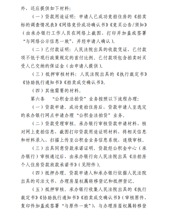 (五)抵押审核。承办银行收集人民法院出具的《执行裁定书》《协助执行通知书》《拍卖成交确认书》(审核原件,复印件加盖或签署“与原件一致”),与办理房屋权属转移登4记、抵押登记的其他材料录入、扫描上传至住房公积金业务系统。公积金中心进行审核。