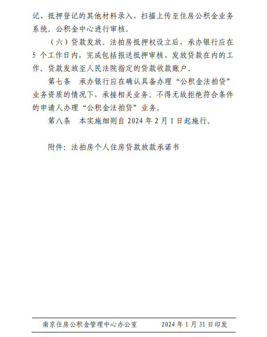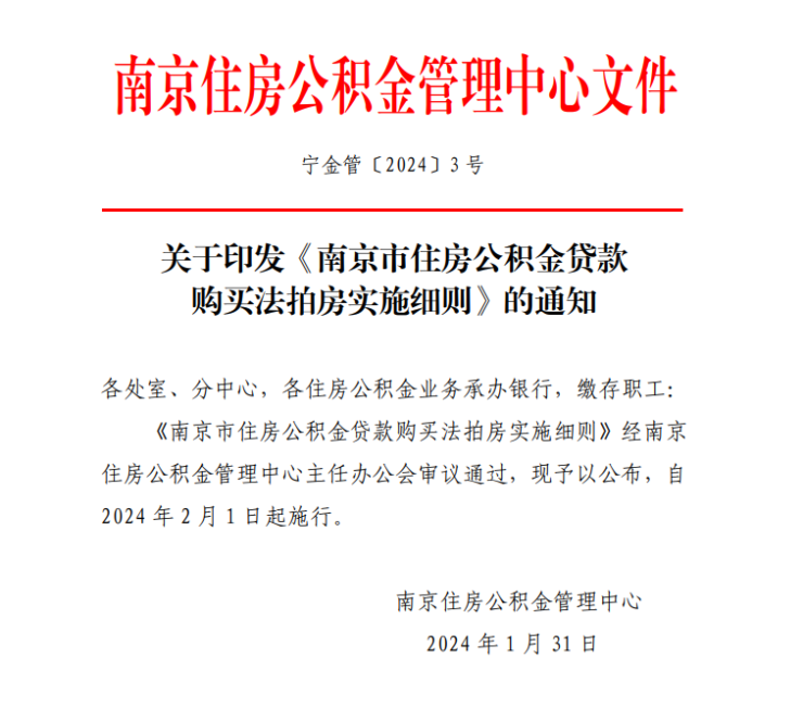 南京住房公积金管理中心发布《南京市住房公积金贷款购买法拍房实施细则》,自2024 年2月1日起正式施行。