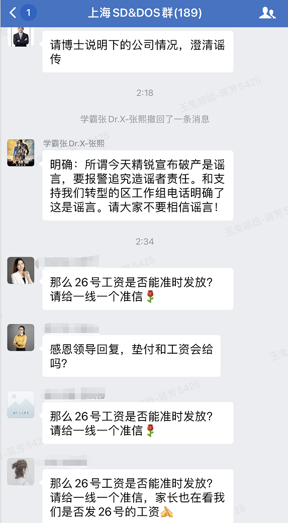 精锐教育创始人张熙曾在办公群中表示,精锐官宣破产是谣言。然而员工们这时候只关心一件事,就是工资能不能在26号准时发放。有报道称,公司本应9日发放工资,目前延迟到26日发,已经两个月没发工资。