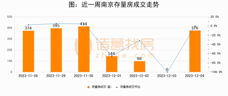 从存量房来看,2023年12月04日南京存量房单日成交376套,比昨日增加376套,环比上涨0%。从近一周存量房成交来看,南京存量房日均成交套数为257套,12月04日单日成交376套,高于近一周平均水平46.3%。