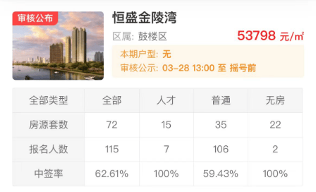 今天河西北的树人本部学区房恒盛金陵湾报名结果已经出来了,72套房源共有115组买房人报名,中签率约62%,大约2个人抢一套。