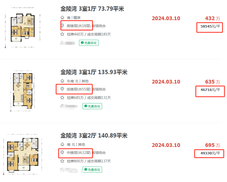 仅3月10日一天就成交了3套,其中18层小高层一套约73平的房源单价卖到了5.8万/平,55层的高层房源价格要便宜一点,成交价基本在4.6-4.7万/平左右。