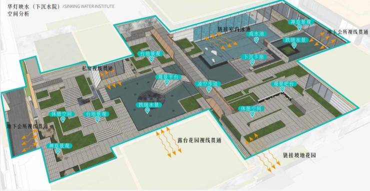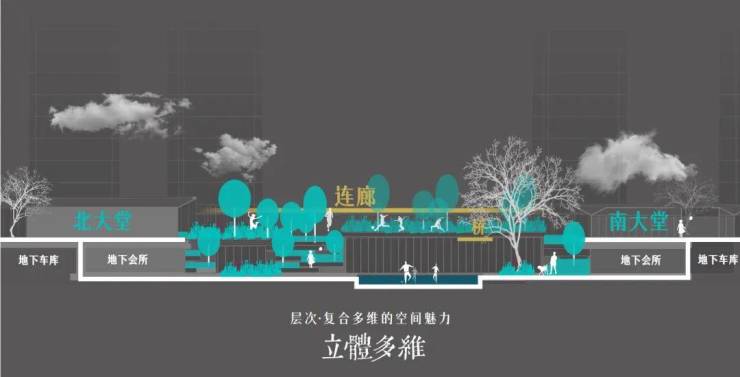 其中约3000方的立体下沉庭院,最大高差约6米,是目前绿城产品体系中最大的下沉空间模块。立体场景彼此交织,并巧妙地融合了40多米长的无柱廊桥,空间相互交错。