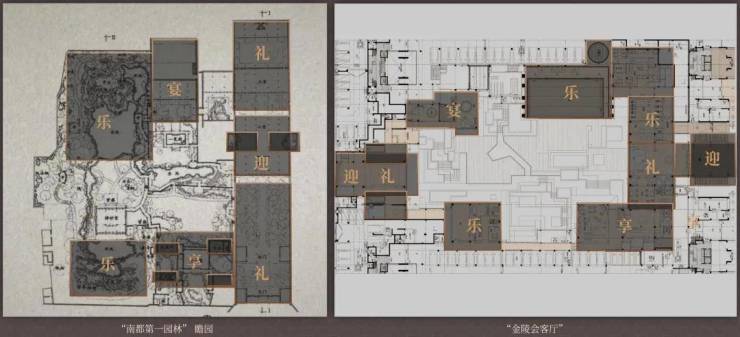 不仅如此,金陵月华的下沉式酒店会所也是非常颠覆,整座会所设计参照南京瞻园的布局特点,提取出“迎、礼、享、乐、宴”五大主题。