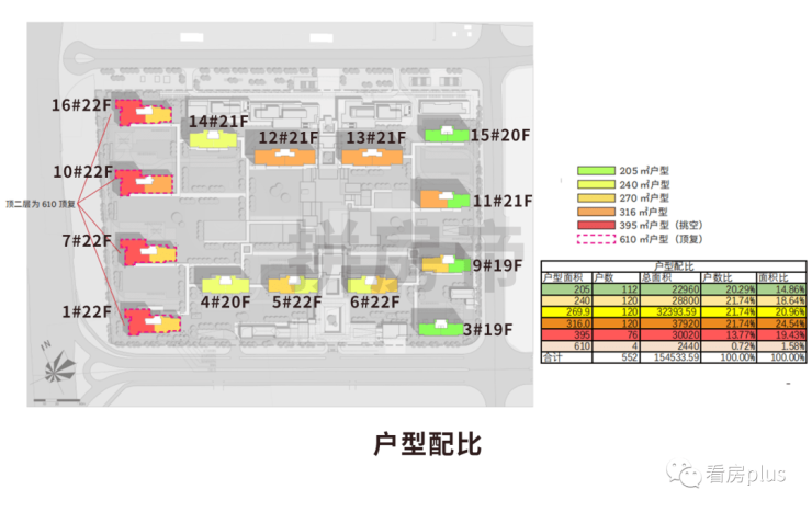 金陵月华整体共552户,主力户型建面约205、240、270、316㎡,此外还有76套395㎡的挑空户型、以及4套610㎡的顶复户型(西侧4栋顶二层)。