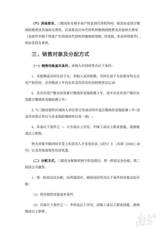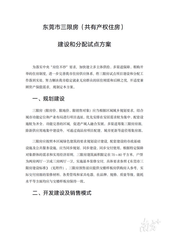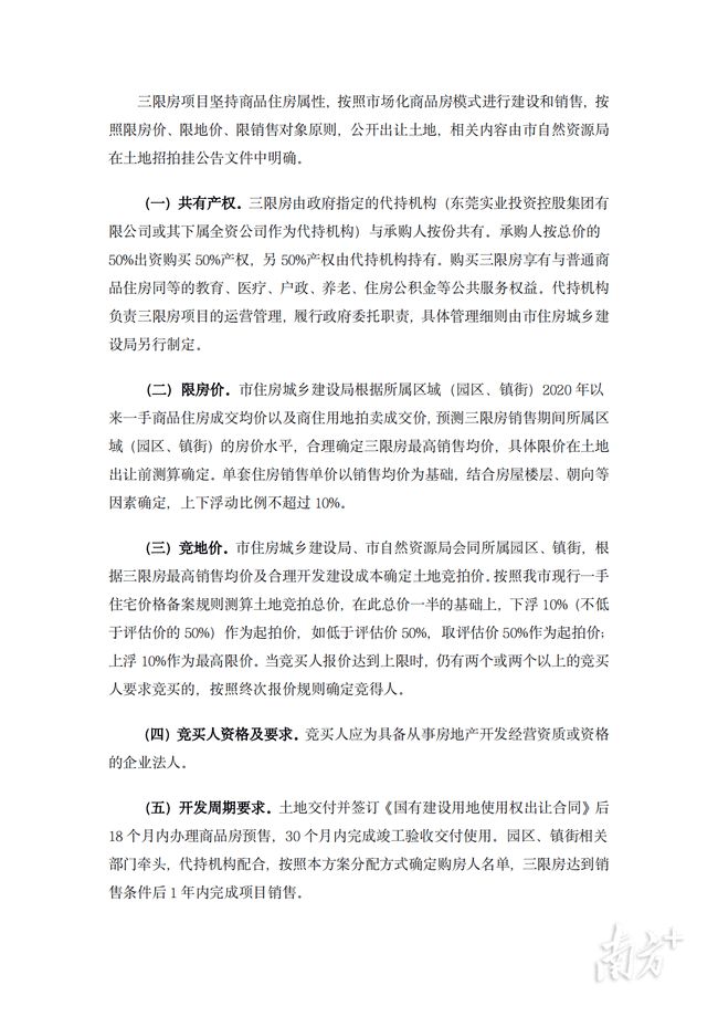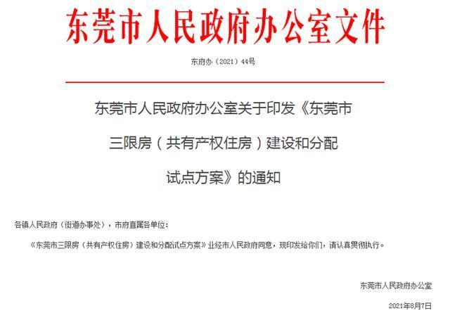 8月23日,广东省东莞市政府印发《东莞市三限房(共有产权住房)建设和分配试点方案》。方案指出,三限房项目坚持商品住房属性,按照市场化商品房模式进行建设和销售,按照限房价、限地价、限销售对象原则,公开出让土地,相关内容由东莞市自然资源局在土地招拍挂公告文件中明确。