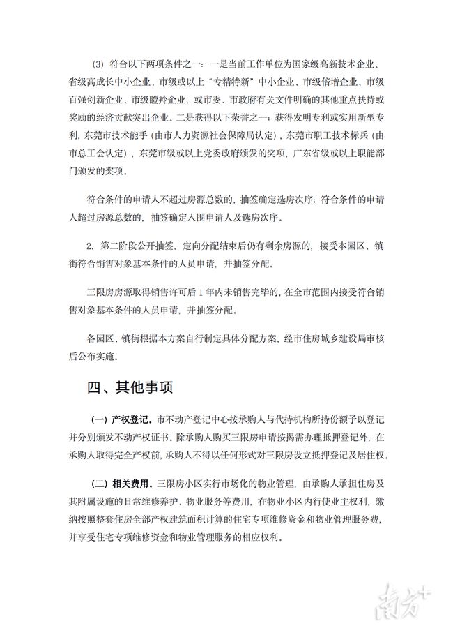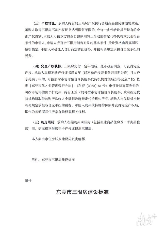 值得注意的是,文件指出,三限房交付一定年限后,经市政府同意,可获得完全产权。承购人取得不动产权证书满5年(以不动产权证书登记日期为准)且入户东莞满3年的,可按届时市场评估价8折购买代持机构份额后获得完全产权;依据《东莞市优才卡管理暂行办法》(东府〔2020〕81号)申领并持有莞香卡的可按市场评估价7折购买,持有玉兰卡的可按市场评估价5折购买。政府指定代持机构所取得的购房款收入全额归政府指定代持机构所有。承购人与代持机构按相关规定承担各自应承担的税费。承购人购买代持机构份额并获得完全产权后,即作为普通商品住房享有物权等相关权利。