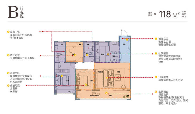 家是居住的空间,也是幸福发生的场所。项目首开将推出建筑面积约97㎡、118㎡两种户型产品,约8.7米阳台、约81.5%得房率,打造生活与场景的舒居哲学。以建筑面积约118㎡户型为例,从悦颜玄关开始,即将归家的仪式感直线拉满;LDK一体化+餐厨岛台设计,奢阔之外,更注重家人之间的情感互动;创新小家主卧理念,空间各自安享又互不干扰;欢享卫浴、超大阳台、成长可变的多功能房…八大生活场景于此呈现。在中粮悦著·九章,生活不止是空间的简单营造,而是涵盖空间美学、成长生活、精神属性的场景体验。