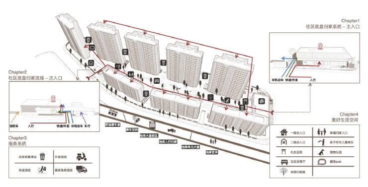 超前的社区底盘规划概念,为整个社区打造活力引擎,支撑和安装社区建筑、室内、景观及各部件。聚焦围墙内外业主高频流线敏感点的体验,沿着6大流线,锁定重点空间模块,进行品质提升。6大流线设计、7种车的分流、6类人的管理,实现全维流线规划管理。同时对接智能时代的社区新需求,着眼于业主的一个个日常生活细节,充满烟火气和温情。