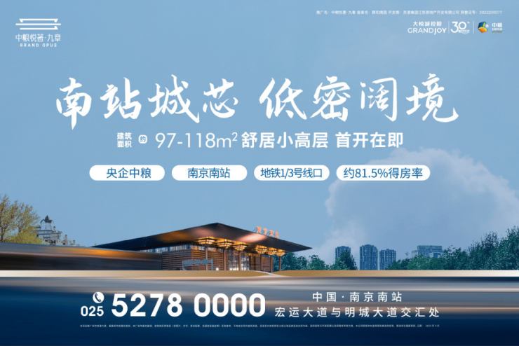 大悦城控股南京区域公司2006年首入南京,以别墅项目颐和南园,深植改善基因,开启了筑迹苏鲁的伟大篇章。17载时光,南京区域公司拓耕不止步,布局江苏、山东、安徽三省,落子南京、济南、青岛、烟台四城,重点拓展合肥城市。2021年南京城芯计划开启,江南、江北双布局——云锦四季&南京首座大悦城,以地标级建筑革新南京人的生活方式;2022年「天悦风华」「天悦锦麟」双子齐耀,热领江北,树立人居标杆;2023 中粮大悦城城芯计划新篇章,落子南京南站,打造首个高端“悦”系悦著产品——中粮悦著·九章。这一次,中粮大悦城为南京更具想象力的生活而来。