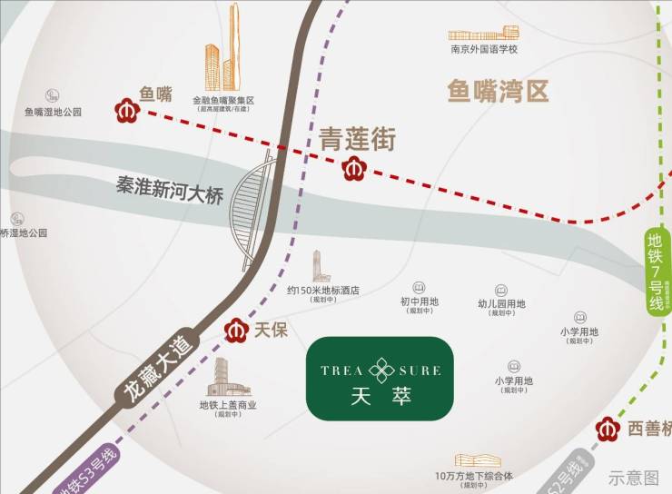 直线距离约300⽶可达S3号线天保站,1站即河西;毗邻7号线(在建)、S2号线(规划中),3线地铁高效便捷畅通全南京;亦可与2号线/10号线近距离换乘,多维轨道交通,提速便捷出行。家门口一条龙藏大道贯通江东南路,坐拥天后大桥、秦淮新河大桥等5座跨河大桥,无缝连接⻥嘴两岸,通勤速度和价值潜力无可匹敌。