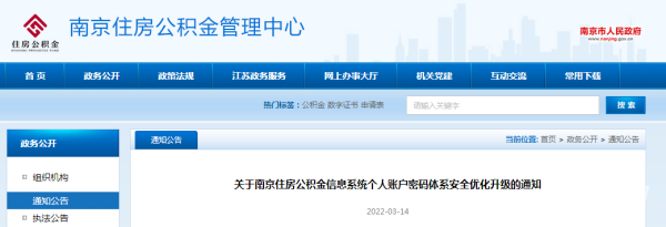 为贯彻落实国家相关法规和标准要求,提升南京住房公积金信息系统个人账户密码安全性,确保缴存职工个人数据安全,南京市住房公积金管理中心近期将对南京住房公积金信息系统个人账户密码体系进行安全优化升级,2022年3月19日起启用新版个人账户密码。