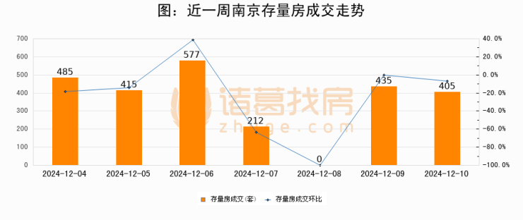 从存量房来看,2024年12月10日南京存量房单日成交405套,比昨日减少30套,环比下降6.9%。从近一周存量房成交来看,南京存量房日均成交套数为361套,12月10日单日成交405套,高于近一周平均水平12.2%。