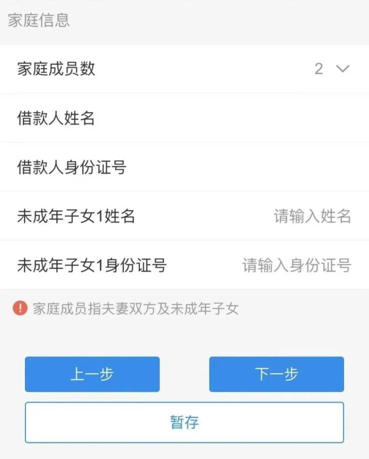 进入家庭成员信息确认页面(家庭成员指夫妻双方及未成年子女)选择家庭成员数并输入家庭成员的姓名和证件号码,确认无误后点击【下一步】。
