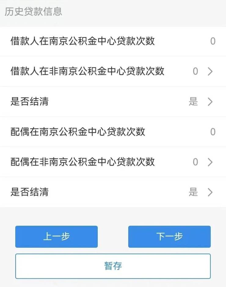 根据您家庭实际贷款情况选择非南京公积金贷款次数以及贷款是否结清(借款人和配偶已经办理了公积金贷款的,在未还清贷款本息之前,任何一方均不能再次办理公积金贷款)。确认无误后点击【下一步】。
