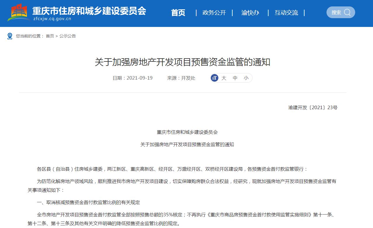 重庆加强房企预售资金监管:首付款监管按预售总额35%核定