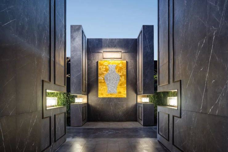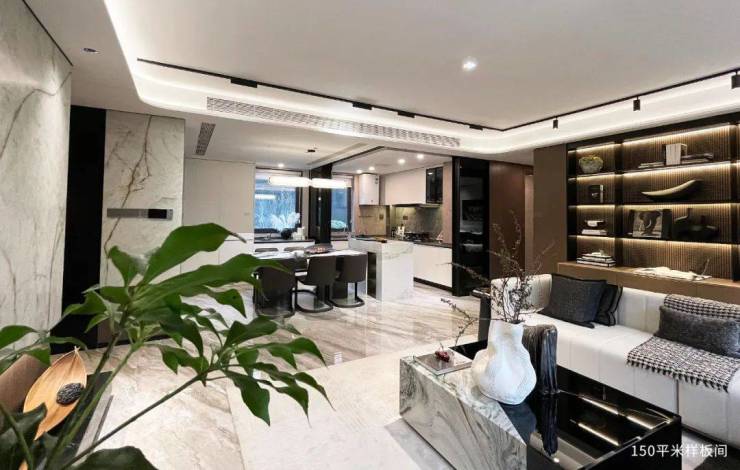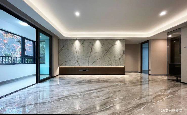 电视背景是几块岩板密拼连接,肉眼同样看不到拼缝,设计灵感来源于天然石材,高级又大气,听说龙湖为此还申请了专利,命名为玉润金陵,触感温润如玉。