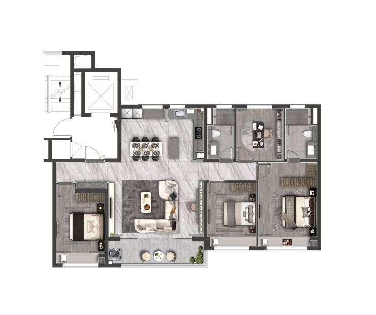 从户型上看,项目打造的两个高端改善户型,均为一梯一户设计,打造大面宽方厅、大尺度270°转角双阳台,居住舒适度非常高。