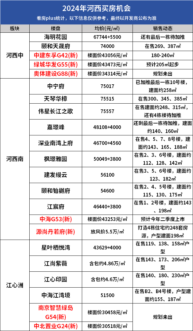 再来看河西南,目前在售项目较多,青奥滨江片区的中宁府、天琴华樟、伟星长江之歌,以及嘉璟峰、深业南湾上府、枫璟雅园、建发缦云、颐和铂樾府、江宸府。