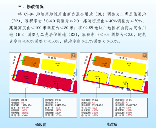 地块总用地面积约2.98公顷,将会调整为空地,并且将原来的科研设计用地/商办混合用地调整为二类居住用地,容积率由≤5.5调整为≤2.4,建筑密度由≤50%调整为≤30%≤100米调整为≤80米,其他指标保持不变。目前地块上市时间待定。