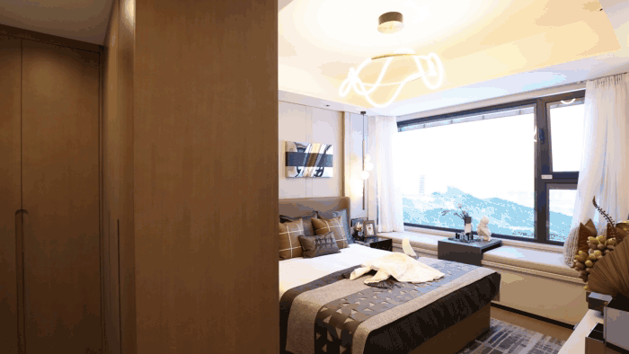 主卧次卧都有270°转角飘窗,带来无边际的全景观光,主卧套房设计,自带独卫和步入式衣帽间,私密感尽显。
