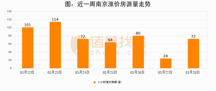 根据诸葛找房数据显示,南京24小时涨价房源量为72套,较03月27日增加48套,环比上涨200%。与此同时,涨价房源占比小幅扩大,业主信心有所提升。