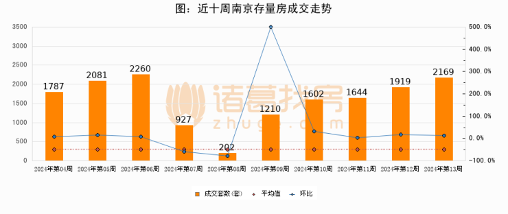 存量房方面,第12周南京存量房成交2169套,较上周增加250套,环比上涨13%。从近十周成交走势来看,周均成交套数为1580套,本周高于平均水平37.3%。