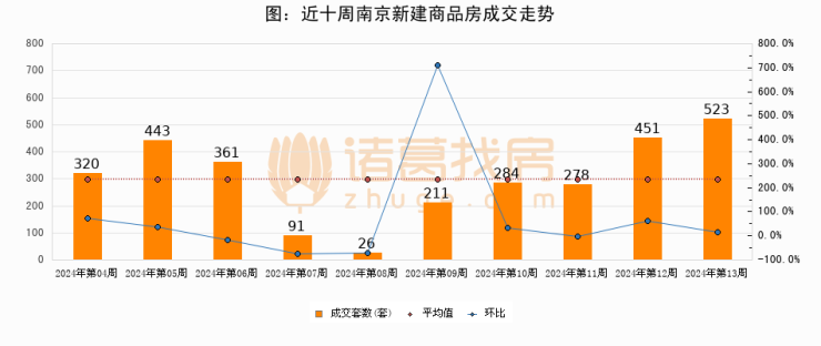 进入2024年第12周(03月18日-03月24日),南京新建商品房成交523套,较上周增加72套,环比上涨16%