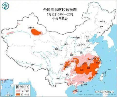 预计7月12日白天,河南南部、安徽、江苏南部、上海大部、湖北、湖南、江西、浙江、福建、四川盆地中东部、重庆大部、贵州东部、广西大部、广东大部、海南岛中部、新疆南疆盆地东部等地有35~36℃高温天气。
